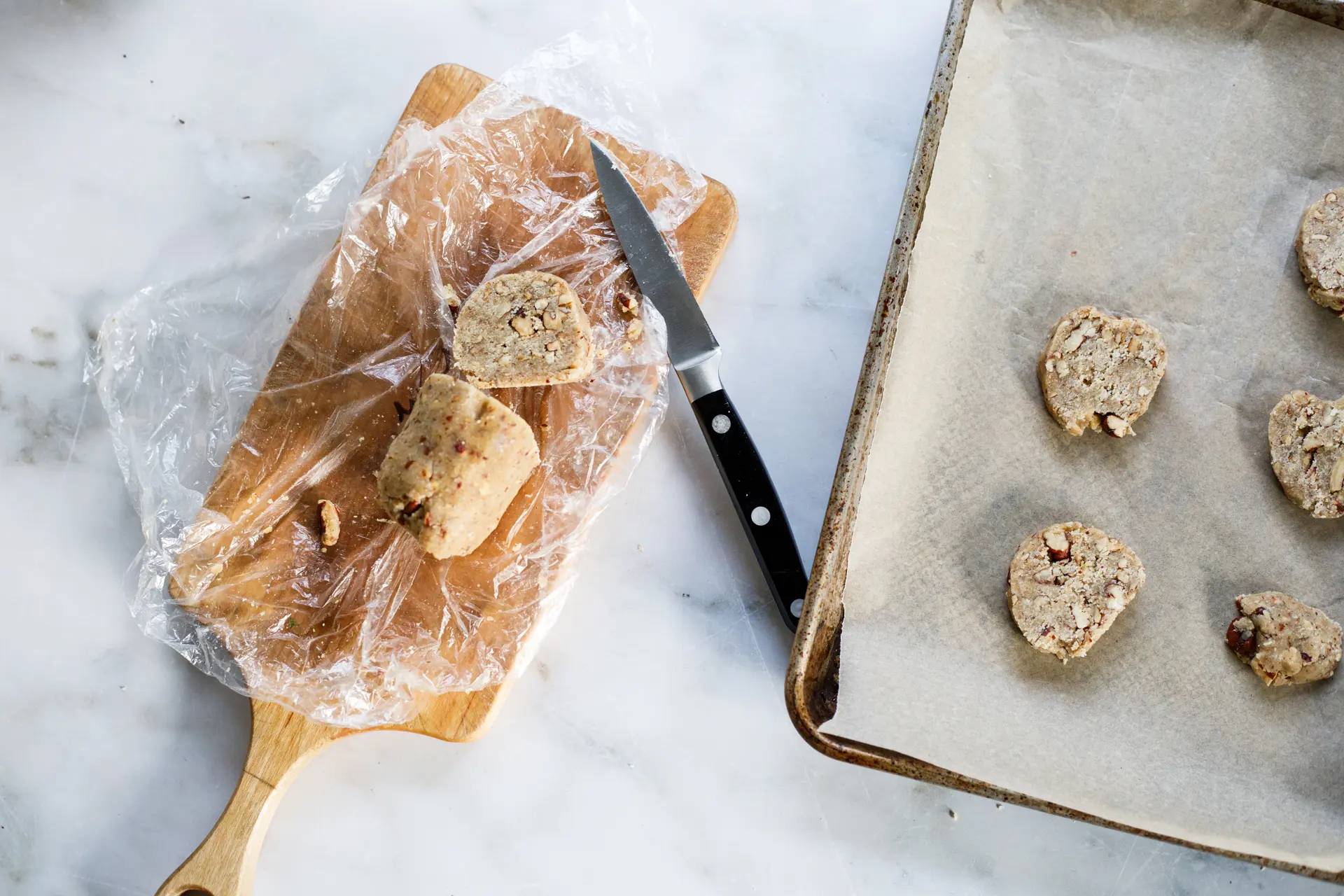 Chill the dough completely for clean slices. Refrigerate the dough logs for at least 2 to 4 hours, or until very firm.
